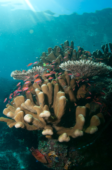 One nearby island, Palau Balembangan, had the sort of reef you dream about diving on – spectacular hard corals so abundant they”re growing on top of each other, not an inch of the slope to be seen anywhere, lots of plate corals and sponge corals, with years of growth evident in their massive sizes, interspersed with lots of feather stars and fans too. The reef on its own would be enough, but making this aquatic landscape come alive were huge clouds of fish too – butterfly fish, fusiliers, zebra fish – all skittering about and chasing through each other. It gave an electric feel to the reef, a sense of real energy in the water. With the afternoon sunrays filtering through the clear visibility, it was a magically lit up kaliedoscope of movement and colour.